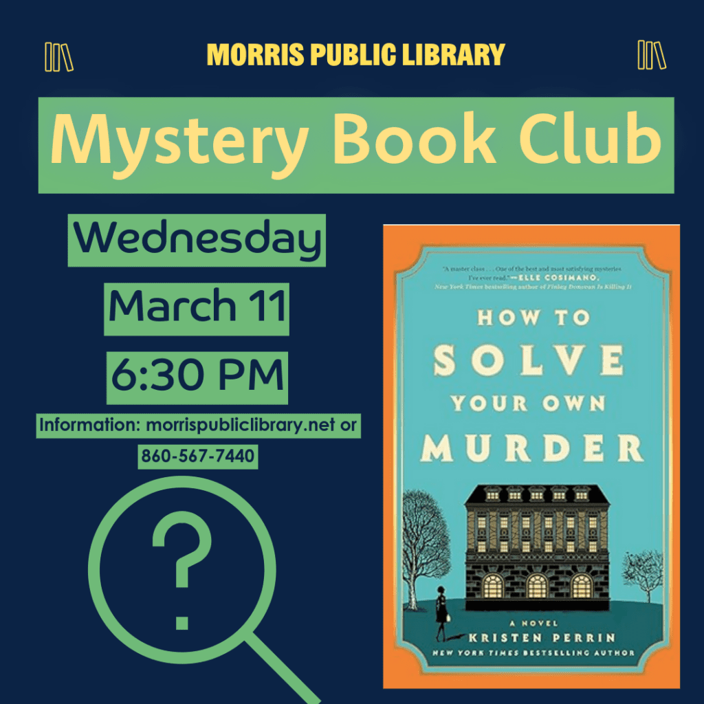 The Mystery Book Club will meet at the Morris Public Library on Wednesday, March 11, at 6:30 PM. The group will discuss “How to Solve Your Own Murder” by Kristen Perrin.