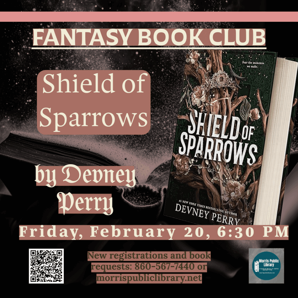 The Fantasy Book Club will take place on Friday, February 20, 6:30 PM. The group will discuss “Shield of Sparrows” by Devney Perry.