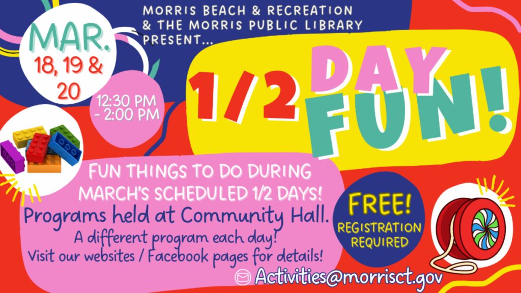 Half Day Fun with Morris Public Library and Morris Beach and Recreation, March 18, 19, 20, 12:30 PM – 2 PM.