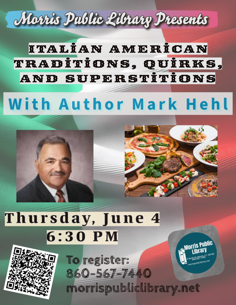 “Italian American Traditions, Quirks, and Superstitions,” with author Mark Hehl, Morris Public Library, Thursday, June 4, 6:30 PM.