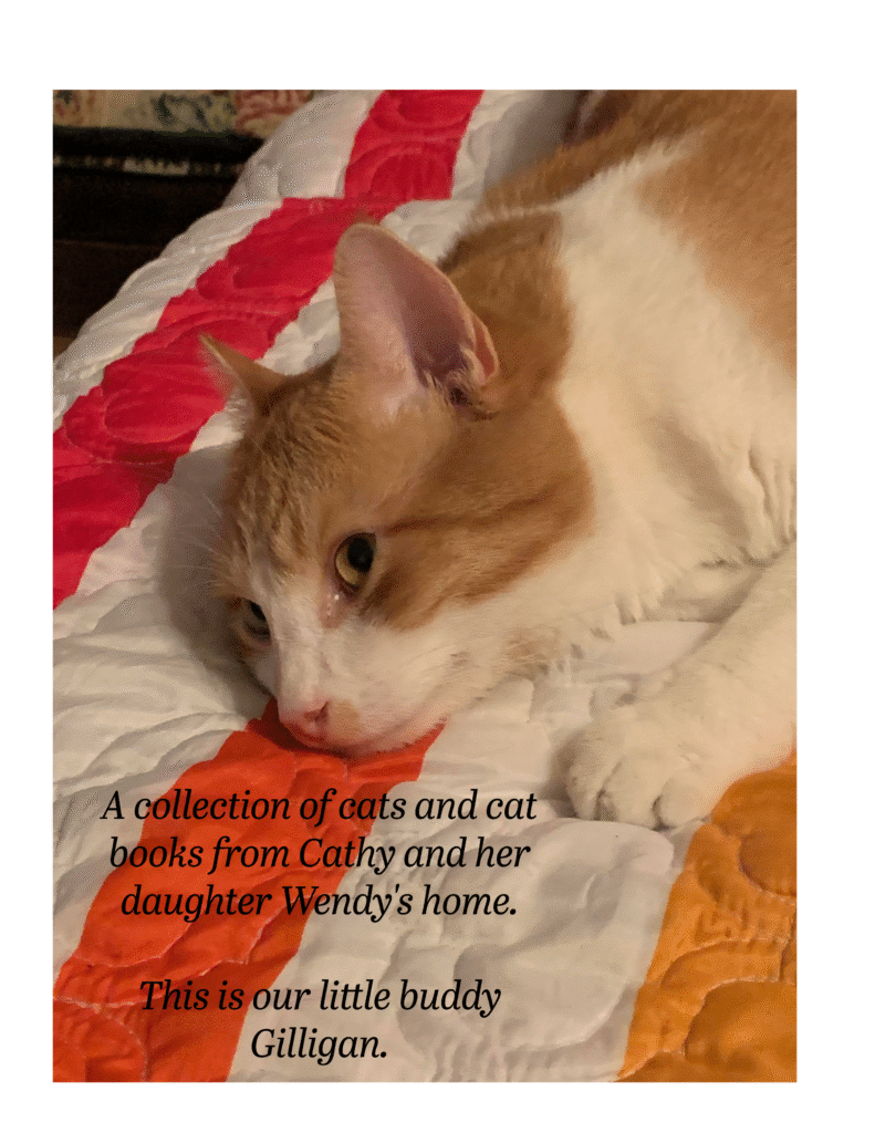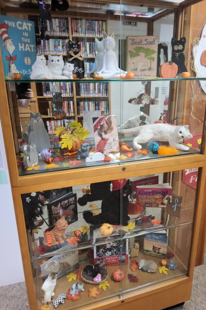 Our October Glass Cabinet Display presents a collection of cats and cat books from librarian Cathy and her daughter Wendy's home.