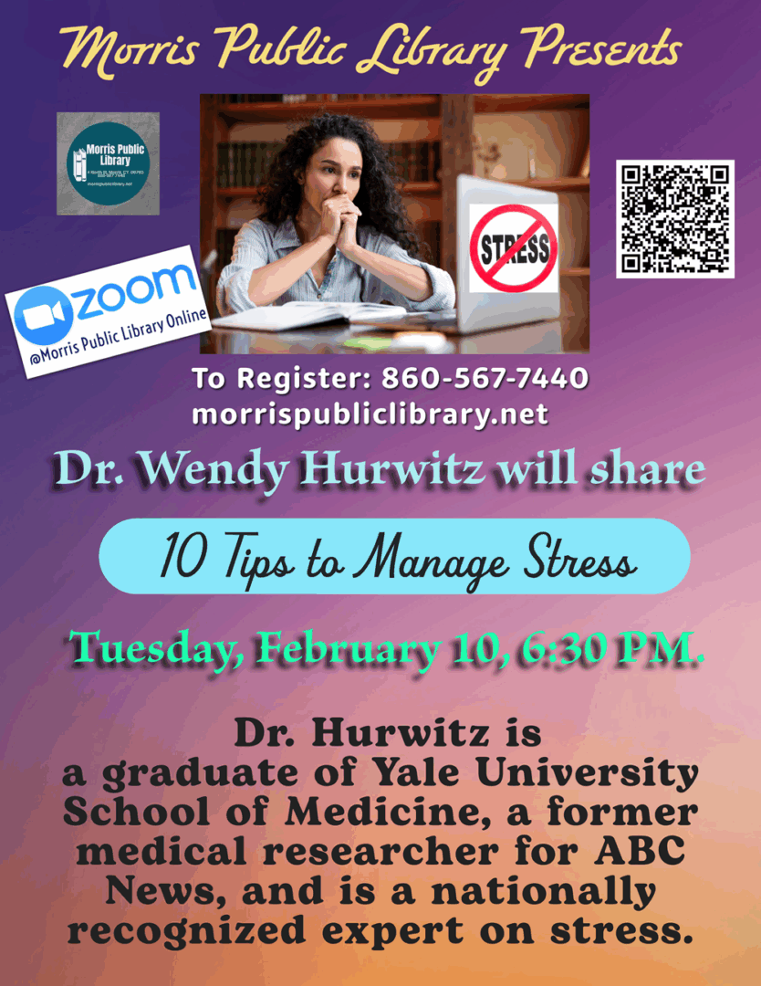 Read More “10 Tips to Manage Stress” with Dr. Wendy Hurwitz, Morris Public Library Online via ZOOM, Tuesday, February 10, 6:30 PM.